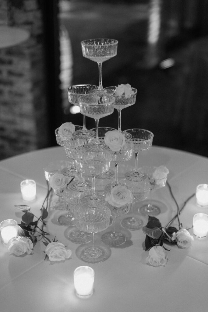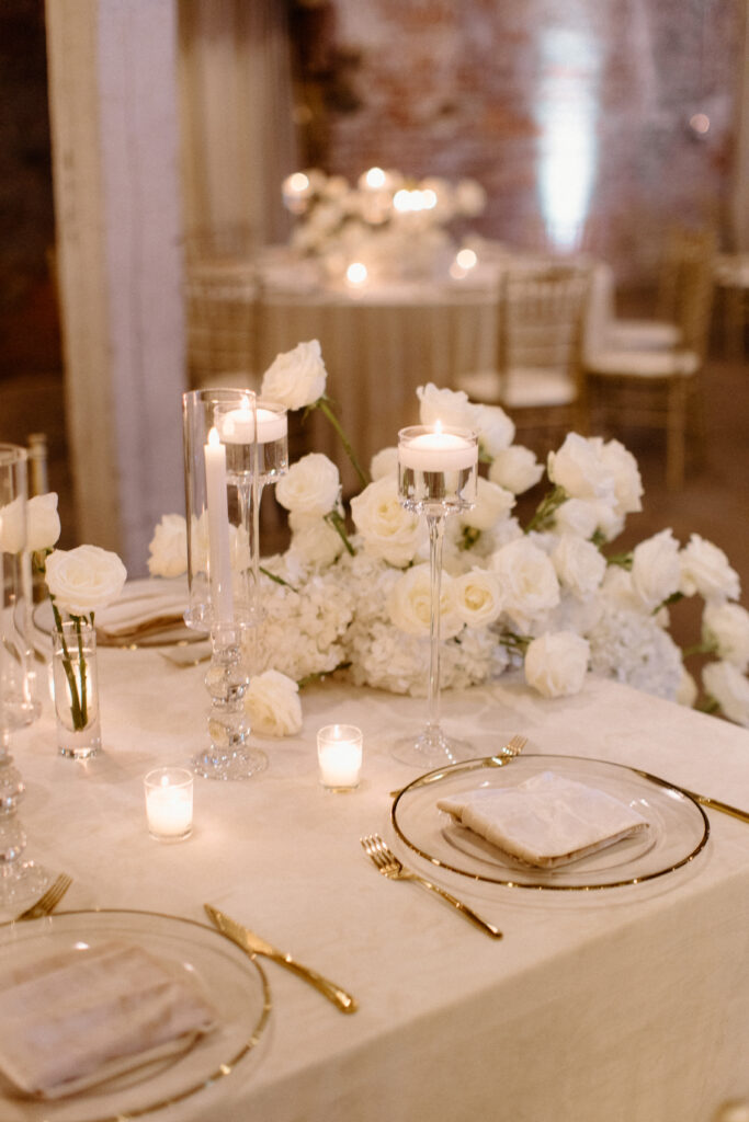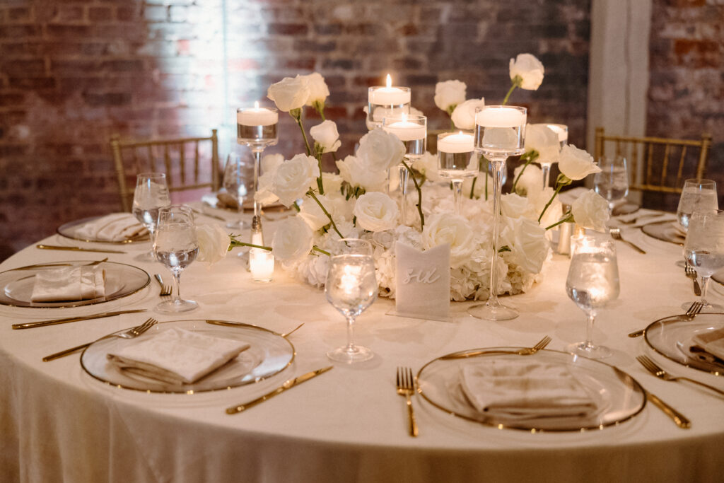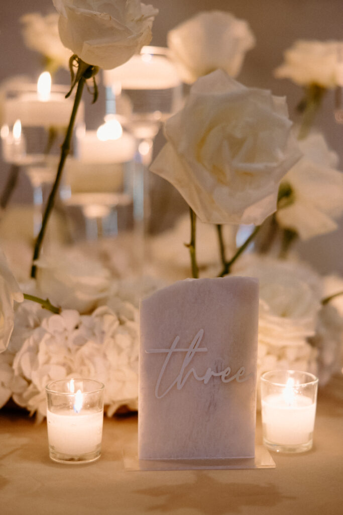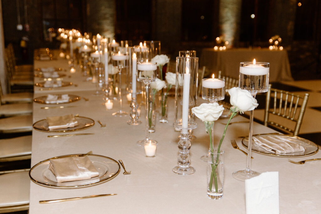 As the celebration moved into the reception, the design shifted to enhance atmosphere and guest experience. The space transformed into an immersive environment centered on connection and celebration. Warm lighting, tailored tablescapes, and refined floral details added depth while maintaining a clean, modern look. In addition, repeated design elements throughout the room created visual rhythm and cohesion. Because of this, the reception felt polished from every angle.