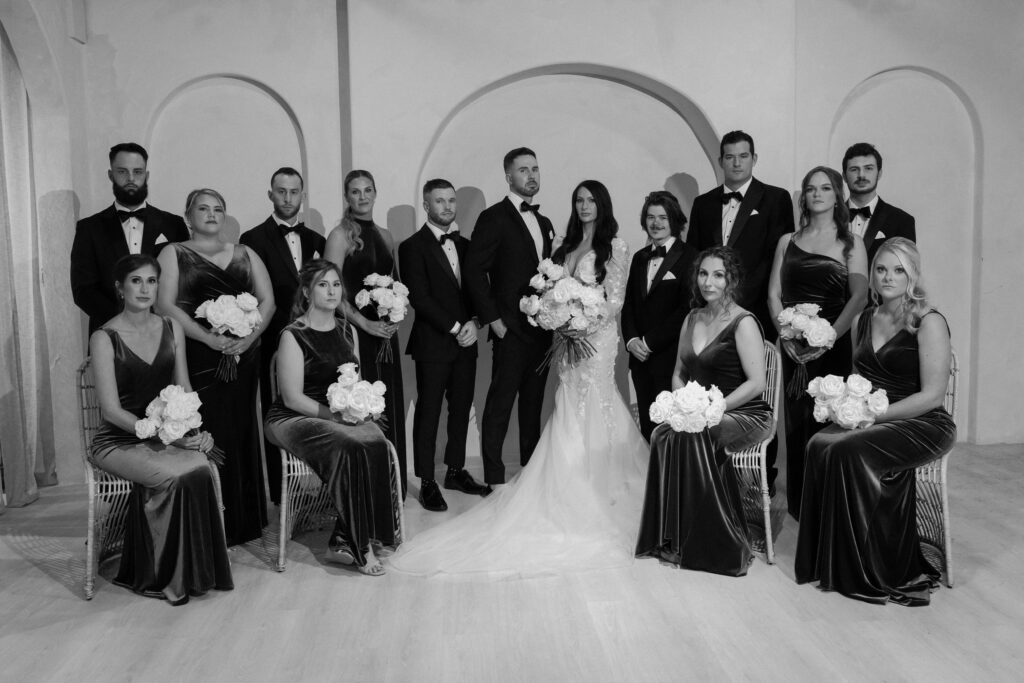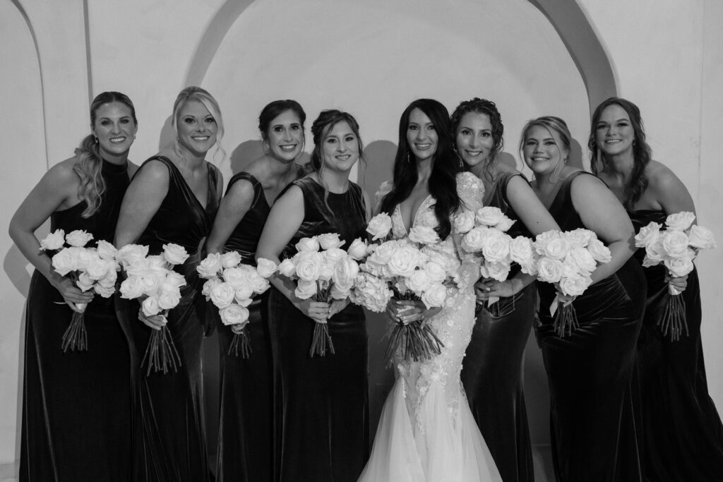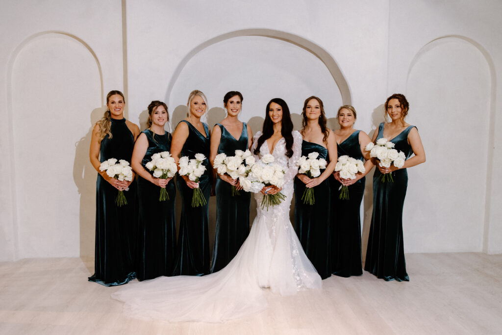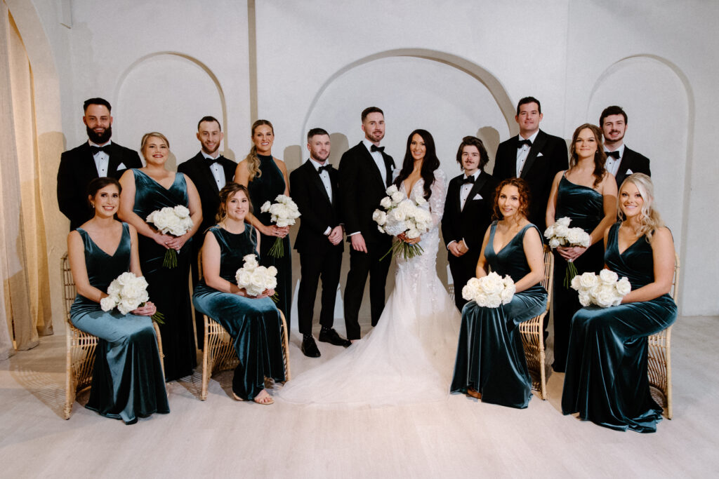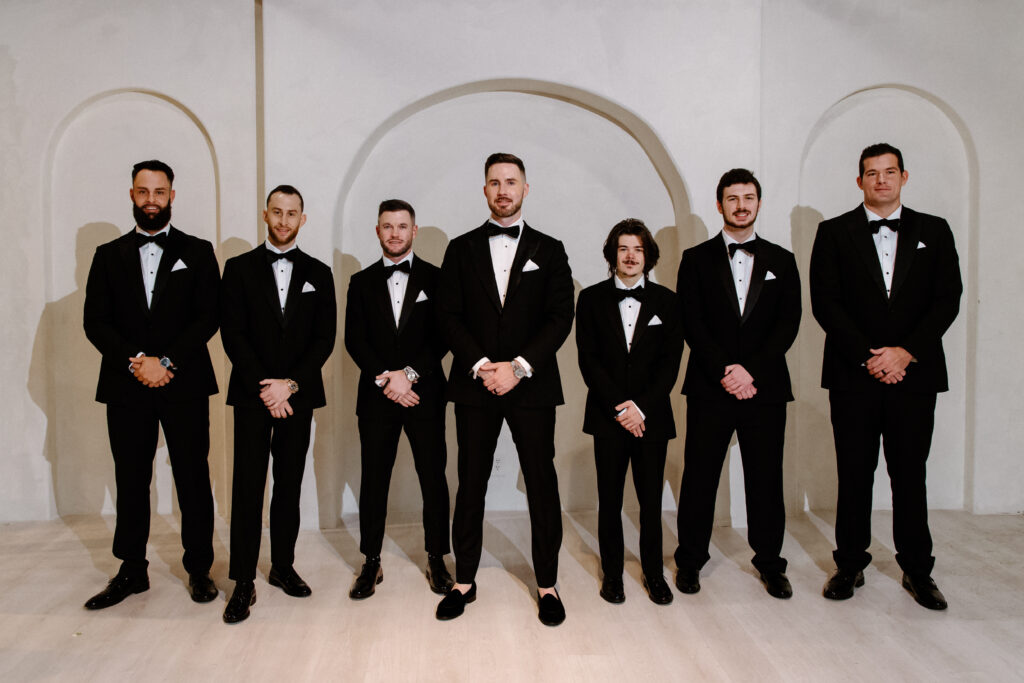 As the celebration moved into the reception, the design shifted to enhance atmosphere and guest experience. The space transformed into an immersive environment centered on connection and celebration. Warm lighting, tailored tablescapes, and refined floral details added depth while maintaining a clean, modern look. In addition, repeated design elements throughout the room created visual rhythm and cohesion. Because of this, the reception felt polished from every angle.