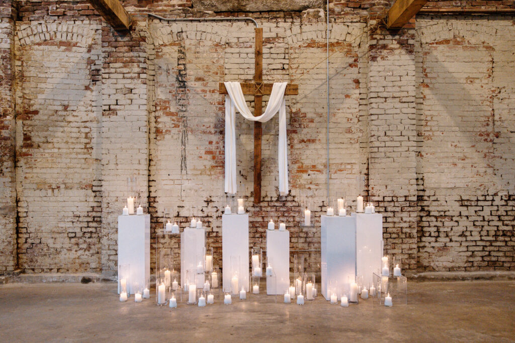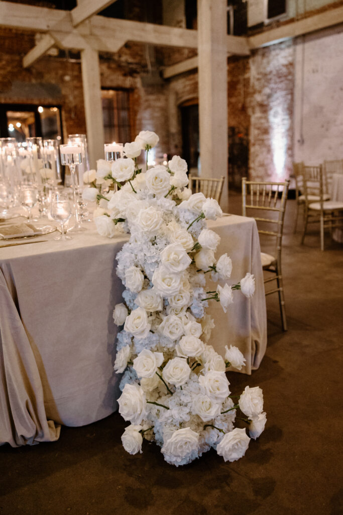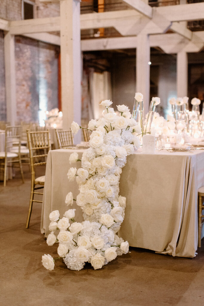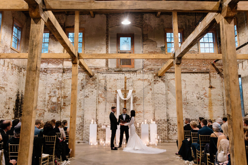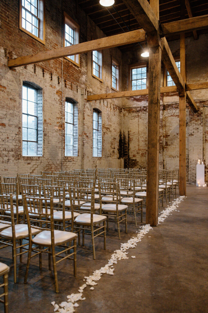 The ceremony design focused on simplicity and scale. Clean architectural features framed the space, while refined floral accents softened the industrial backdrop. Rather than competing with the venue, the design highlighted its character through thoughtful placement and restraint. As a result, the ceremony felt composed, modern, and impactful.