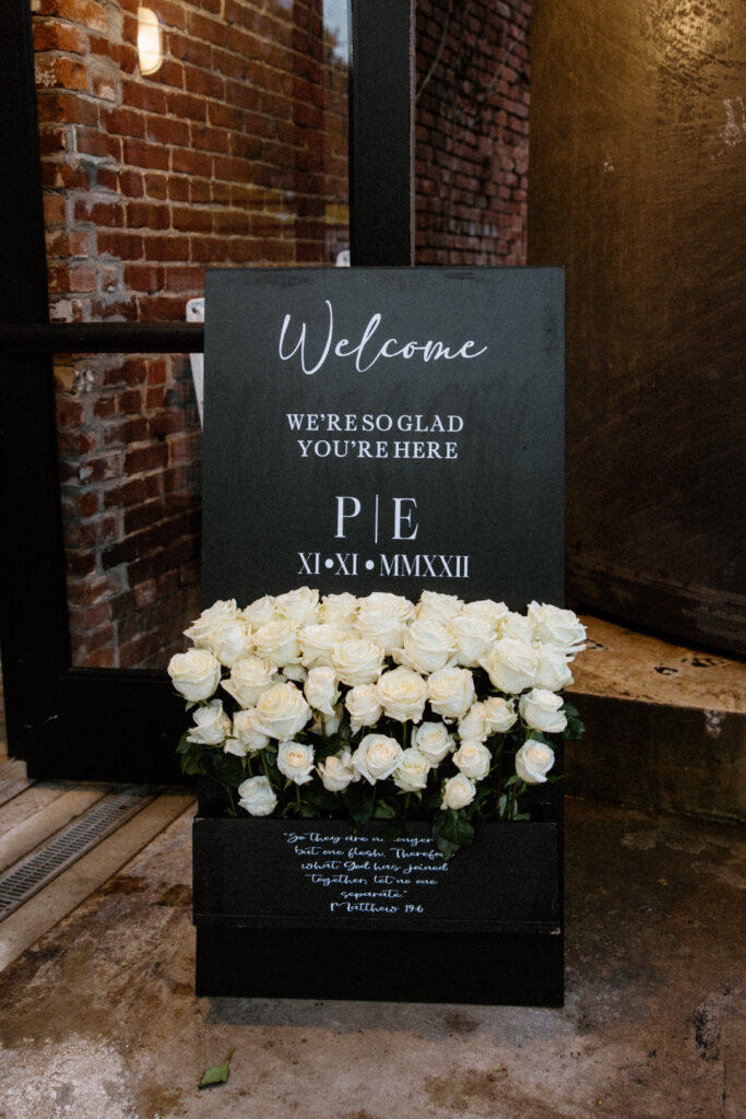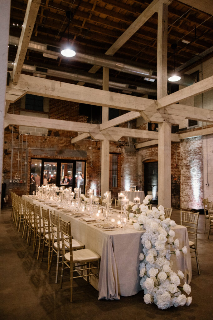 Designed by House of BASH, an Atlanta wedding planner and wedding florist, this Guardian Works wedding reflected Paris & EJ’s vision for a celebration that felt modern, intentional, and elevated. The final result honored the venue’s industrial aesthetic while delivering a refined wedding experience that felt stylish, confident, and memorable.