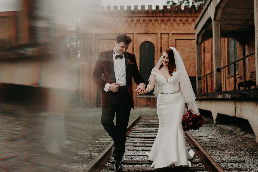 Their wedding at the Georgia Railroad Museum stood out for its unconventional venue choice and relaxed approach to tradition. Located in the heart of Savannah, the museum offered an open-air setting filled with historic railcars, brick pathways, and industrial details. From the beginning, the day felt creative, personal, and intentionally different.