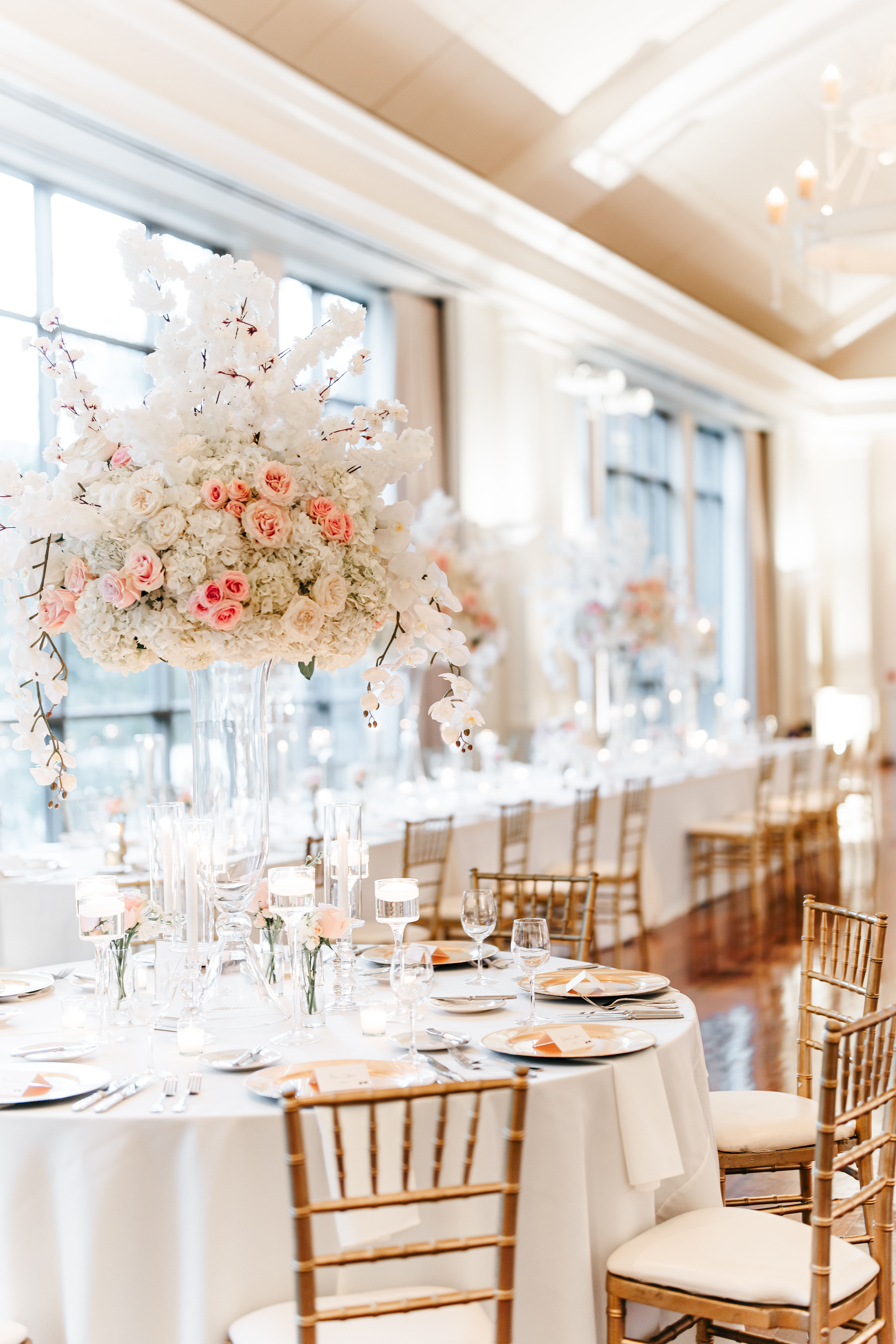 After the ceremony, the celebration transitioned seamlessly to the Atlanta History Center for the reception. The design evolved to suit the scale of the space while maintaining continuity with the earlier moments of the day. Warm lighting, tailored tablescapes, and refined floral accents created an inviting atmosphere that encouraged connection and celebration. Rather than overwhelming the venue, each element enhanced the room and supported the natural flow of the evening.
